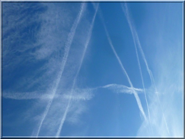 Pour illustrer mes propos, voici une image d’un tout petit bout de ciel au dessus de Salvagnac où l’on peut compter, par moments, notamment les veilles de week-end, une trentaine de traînées d’avions, c’est hallucinant ! Artiste dans l’âme, j’ai pris la photo pour former un « A », pour « Attention ».