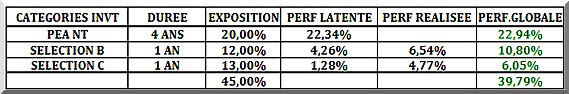 1er et 3ème tableaux, les positions latentes « B » et « C » : +4.26%+1.28% = +5.54% pour (13%+12%) 25% de capital utilisé (sous-entendu d’un investissement global diversifié sur actions) – performance relative sur 100% du capital utilisé : (5.54/25) = +22.16%.